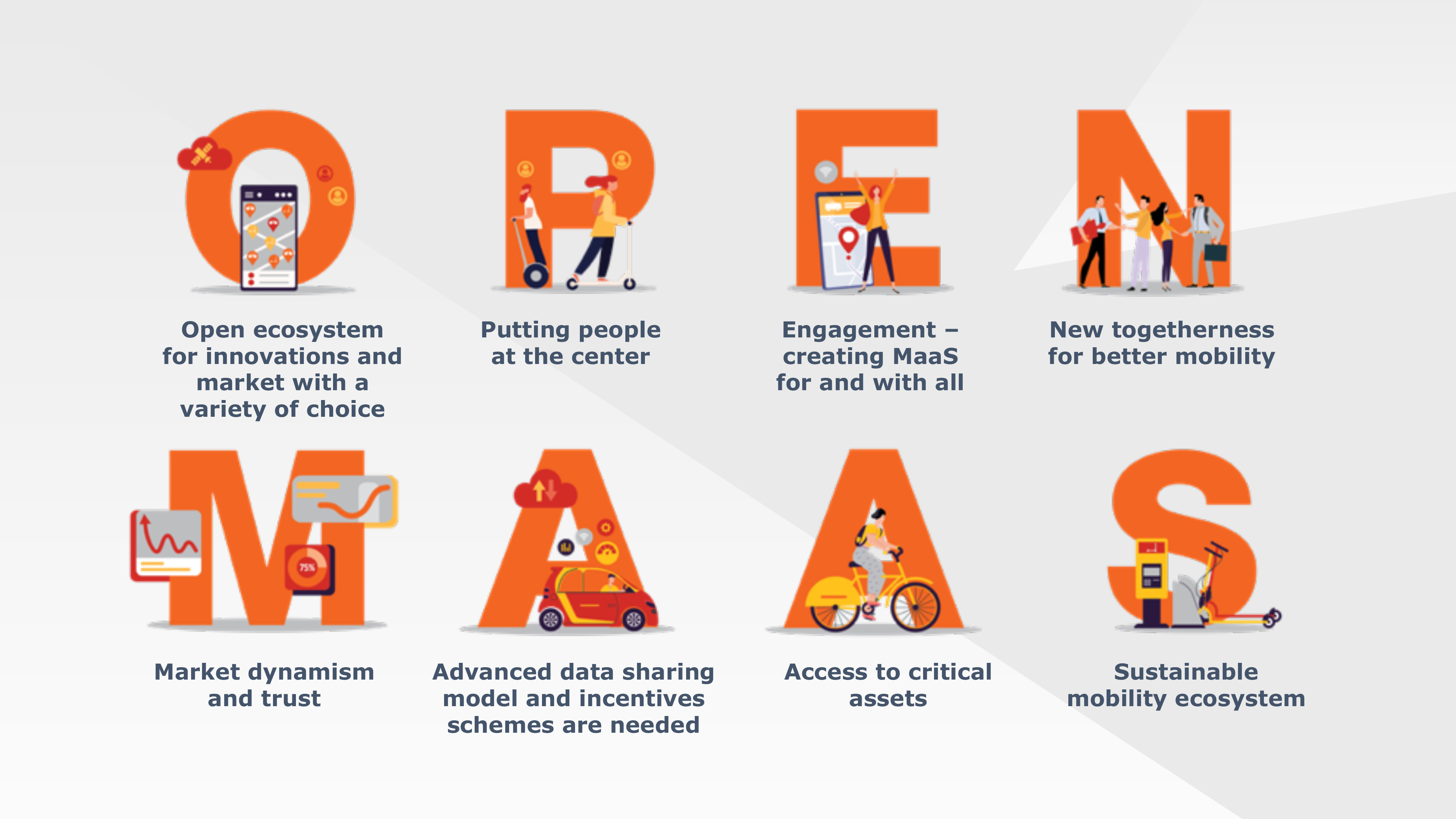 This generated a specific design challenge for ALCHEMISER, who tapped into the world of illustration and iconography to create a coherent visual MaaS environment, which supports and visually brings forth the copy, and more importantly the MaaS Alliance vision. Best illustrated through the design of the eight principles for an Open MaaS Ecosystem.